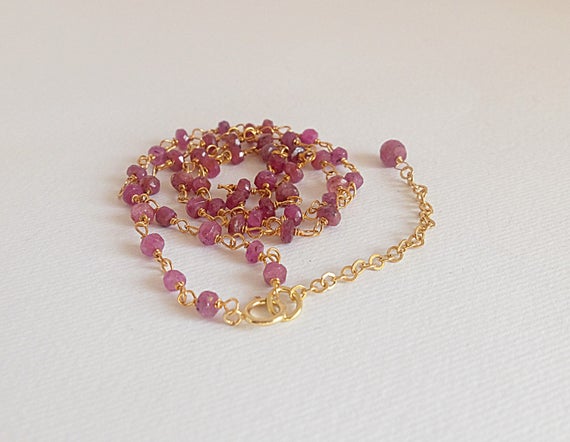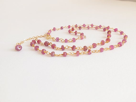 At a Great PriceAAA++ Rare Quality Dainty, feminine Ruby handwrapped,rosary style necklace, handwrapped with Gold filled wire,Ruby rondelles rosary style necklace,ruby jewels 3 mm Code- TJH131