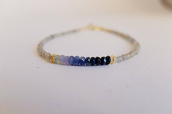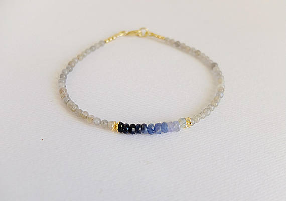 At a Great PriceAAA++ Rare Quality Labradorite bracelet with ombre blue sapphire and Gold filled filigree caps. skynny, minimal sapphire labradorite bracelet, blue sapphire 2 mm Code- TJH106
