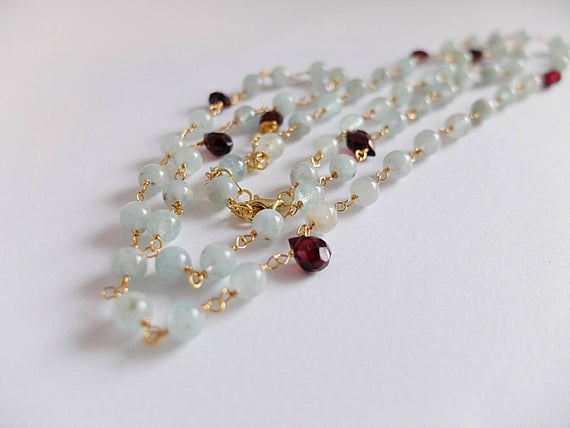At a Great PriceAAA++ Rare Quality Long beautiful Aquamarine necklace,rosary style Gold filled necklace,Aquamarine smooth spheres,Rhodilite Garnet briolettes milk aquamarine 6 mm Code- TJH135