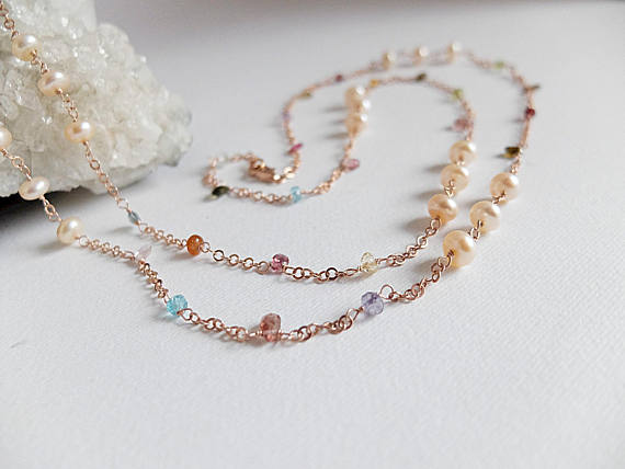 At a Great PriceAAA++ Rare Quality Long Multi gemstone and pearl Necklace,multi gemstone semiprecious necklace,multi color necklace,rose Gold filled necklace,rose Gold chain 3-4 mm Code- TJH183