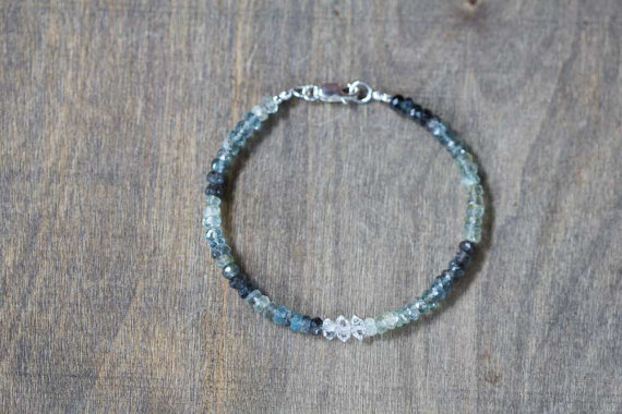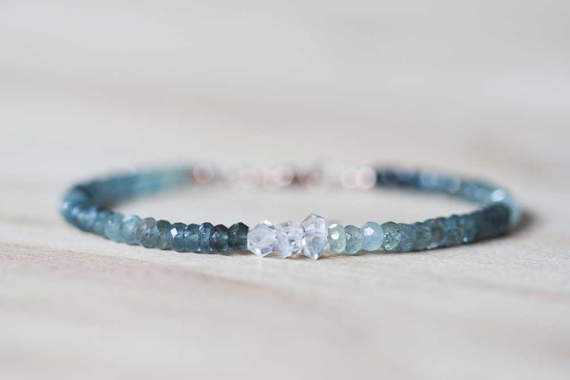 AAA++ Rare Quality Moss Aquamarine Bracelet with Herkimer Diamonds, Delicate Quartz Crystal Jewelry, Beaded Shaded Moss Aquamarine Jewelry, Sterling Silver Plated4-4.25mm 7 inches Code- TJH498