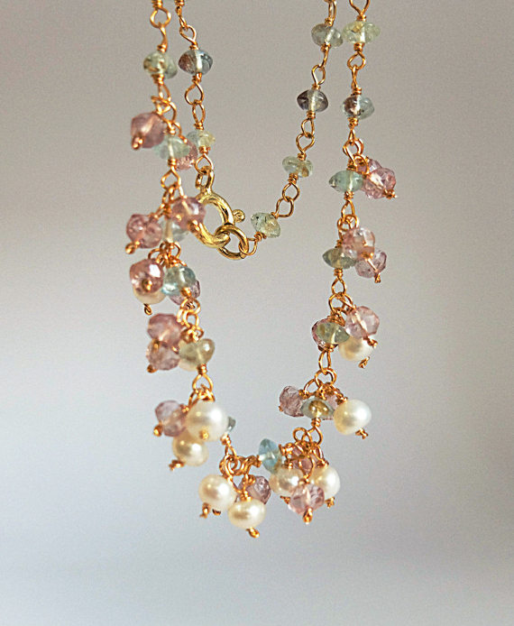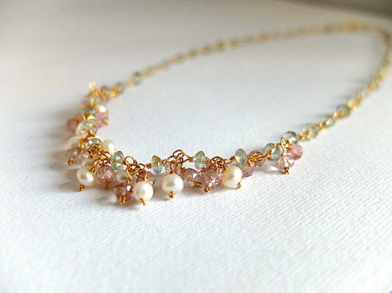 At a Great PriceAAA++ Rare Quality Moss aquamarine smooth gemstone,Rose Quartz and freshwater pearl cluster rosary style necklace Wire wrapped gemstone,pastel color rosary 4 mm Code- TJH178