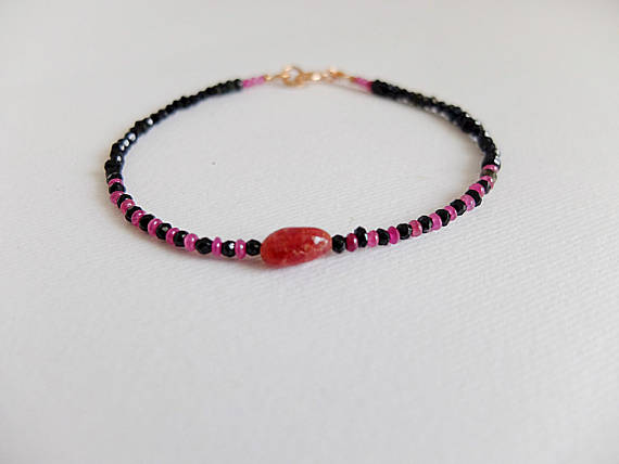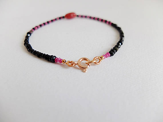 AAA++ Rare Quality Natural Black Spinel & Ruby Layering minimalist skinny bracelet, rose Gold filled pink ruby,Gemstone bracelet, slender black and pink 2 mm Code- TJH78