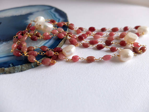 At a Great PriceAAA++ Rare Quality Pink Gemstone and Pearl,long necklace,Gold filled,Multi-way chain necklace made from Rhodochrosite, and large freshwater white pearls 5-7 mm Code- TJH166