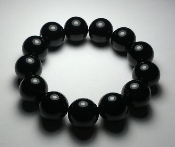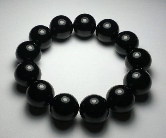 Anniversary Gift 16mm black Black Onyx Stretchable Bracelet Round, Smooth 18cm for mens, womens, gf, bf and adults.