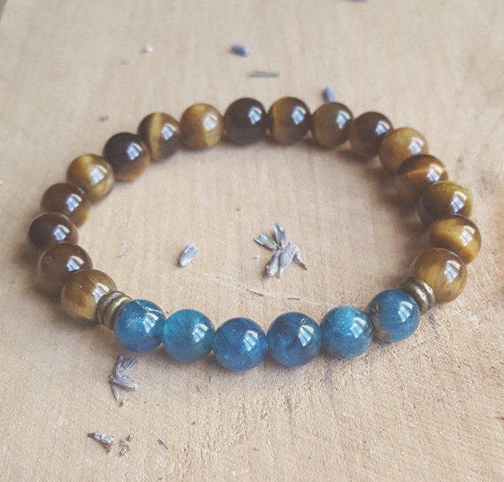 At a Great PriceAnniversary Gift 8mm Stretchable Multi Blue Apatite & Gold Tiger Eye Bracelet Round, Smooth 7" for mens, womens.