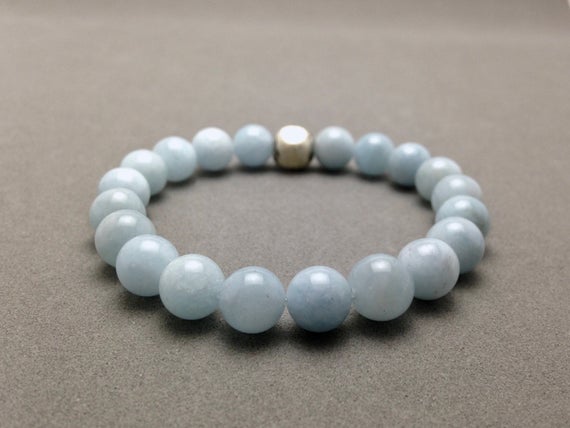Aquamarine and Karen Hill Tribe Silver Stretch Bead Bracelet for Reducing Stress, Instilling Courage and Protection from Pollutants 8mm Code- WAR6218