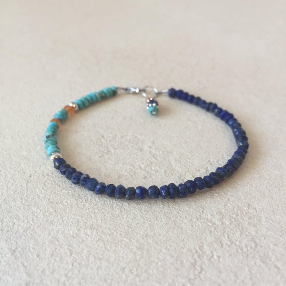 At a Great PriceArizona Sleeping Beauty Turquoise Lapis Lazuli Carnelian Karen Hill Tribe Thai Silver Beaded Bracelet, Sundance Style, Boho Chic Bracelet 3-5mm Code- WAR6414