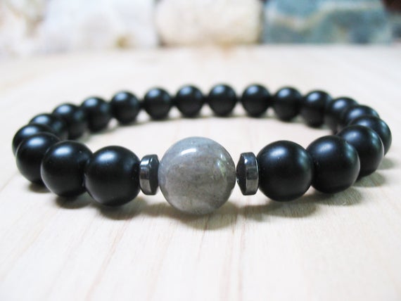 At a Great PriceBridesmaid Jewelry 10mm Stretchable black & grey Black Onyx & Labradorite Bracelet Round, Smooth 7.5" for mens, womens, GF, BF, Adults.