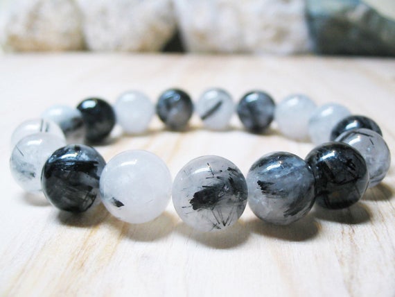 At a Great PriceBridesmaid Jewelry 10mm Stretchable black & white Tourmaline Quartz Bracelet Round, Smooth 7.5" for mens, womens, GF, BF, Adults.