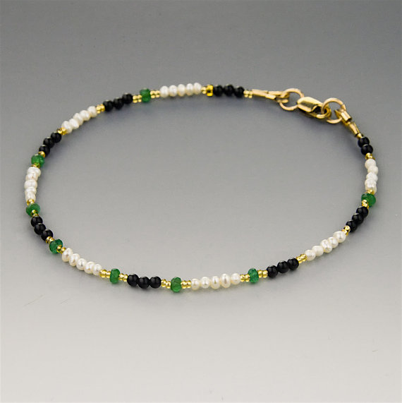 At a Great PriceGenuine Natural Emerald, Pearl, & Onyx Bracelet with Gold Clasp, Delicate Green, White, Black Gemstone Bracelet, Stackable Tiny Gem Bracelet 2-2.5mm Code- WAR6838