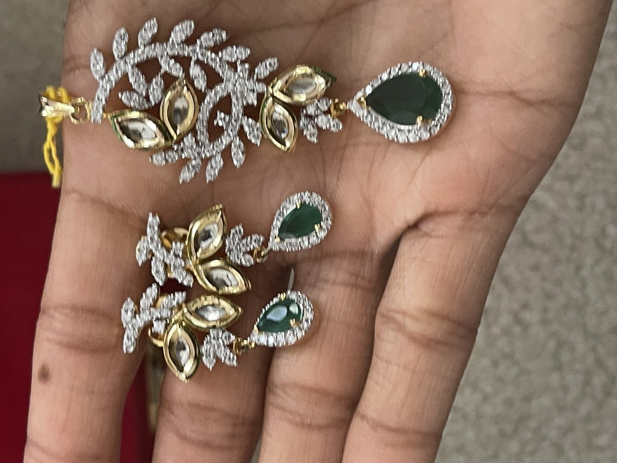 At a Great PriceHigh Quality American Diamond, Cubic Zirconia, Kundan and Qreen Quartz Leaf Pendant and Earring set