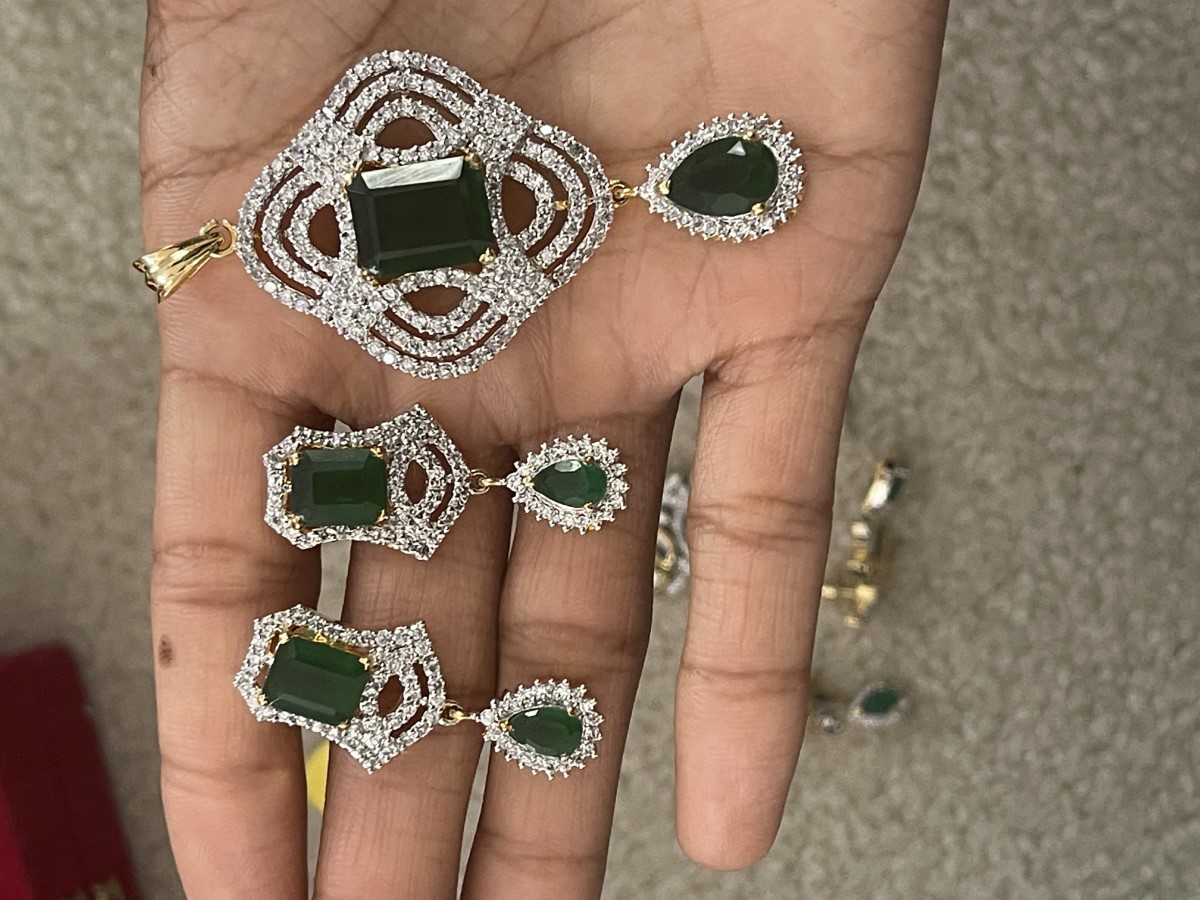 At a Great PriceHigh Quality American Diamond, Cubic Zirconia, Kundan and Qreen Quartz Square Pendant and Earring set