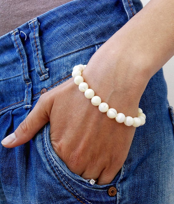 At a Great Pricelove beach youth 8mm White Mother of Pearl Stretchable Bracelet Round, Smooth 18cm for mens, womens, gf, bf and adults.