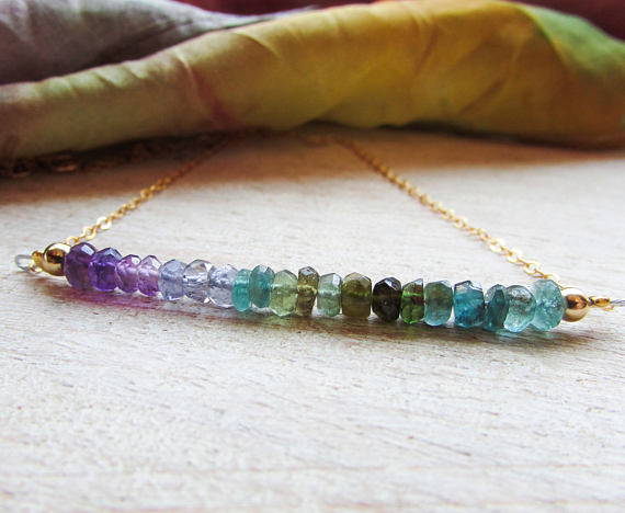 Ombre necklace, Gradient stone, Multicolor stone, Amethyst Tourmaline, Green Purple, rainbow, Boho, romantic, unique colorful, Nature lover 3-4mm Code- WAR6772
