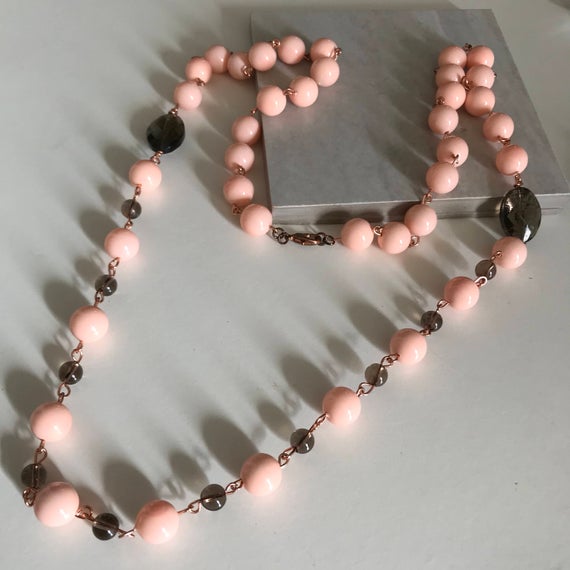 At a Great PricePeach shell Pearl & Smoky Quartz Genuine Gemstone rose gold long statement beaded necklace 6mm Code- WAR6629