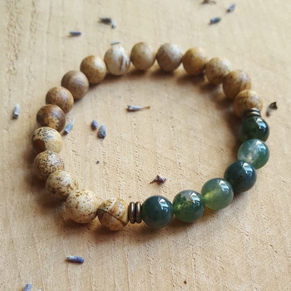 Personalized Gift 8mm Stretchable Multi Moss Agate & Picture Jasper Bracelet Round, Smooth 7" for mens, womens.