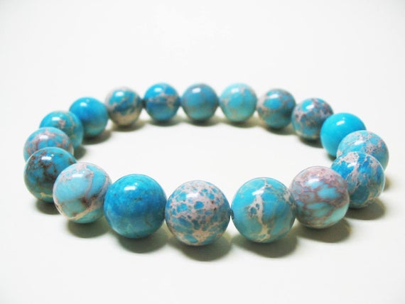 At a Great Pricetop quality 10mm Stretchable blue Blue Variscite Bracelet Round, Smooth 7.5' for mens, womens, GF, BF, Adults.