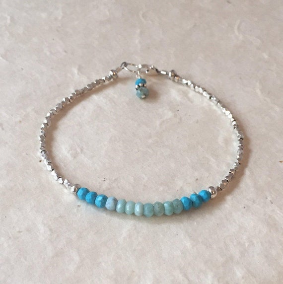 At a Great PriceTurquoise and Larimar Karen Hill Tribe Thai Silver Beaded Bracelet with Dangle, Sundance Style, December Birthstone, Boho Stack Bracelet 3-4mm Code- WAR6393