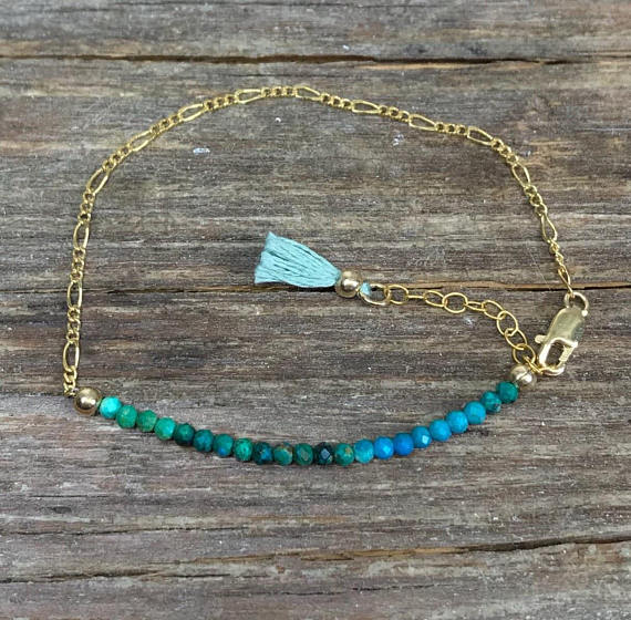 At a Great PriceTurquoise gemstone bracelet / Chrysocolla bracelet / Bohemian bracelet / Dainty gemstone bracelet / Boho jewelry / Tassel bracelet / Skinny 2mm Code- WAR6733
