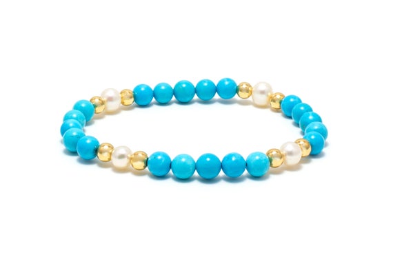 Turquoise Pearl Bracelet/ Turquoise and Freshwater Pearl Bracelet/ Pearl and Turquoise Jewelry/ Gold Pearl Bracelet 6mm Code- WAR9056