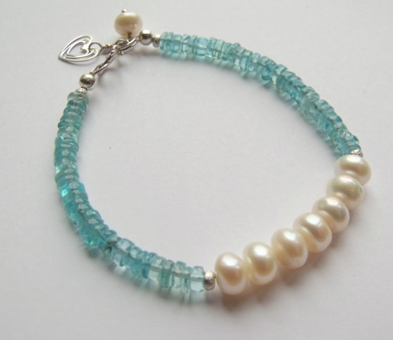 At a Great PriceWhite Cultured Rondelle Pearl with Blue Apatite Heart Charm Sterling Silver Bracelet 3-5.5mm Code- WAR6506