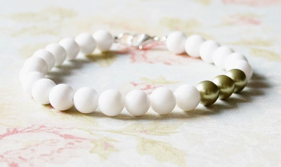 At a Great PriceWhite Gemstone Bracelet, Green Swarovski Bracelet, Pearl Bracelet, Stacking Bracelet, White Mountain "Jade" And Light Green Pearls Bracelet 6mm Code- WAR9120