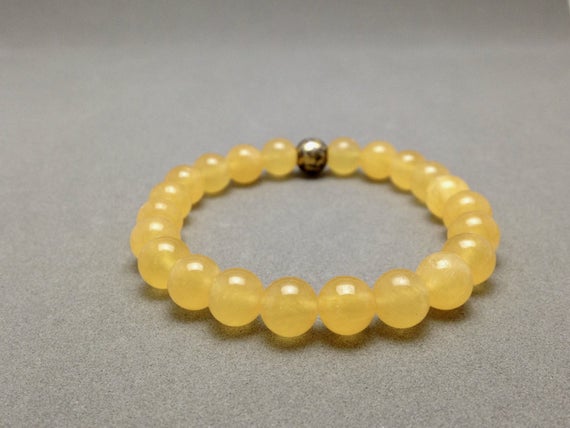 Yellow Calcite & Brass Om Mani Padme Hum Stretch Bead Bracelet for Balancing Solar Plexus, Increased Self Esteem, Self Worth and Motivation 8mm Code- WAR6245